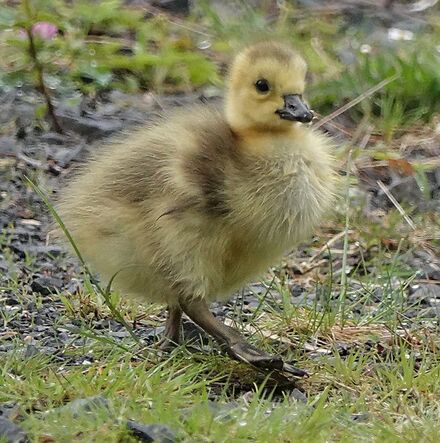 Nun endlich watschelt das kleinste der vier Gössel hinter den anderen her und staunt über die vielen neuen Stimmen um sich herum. Sofort läuft es schneller, denn die Geschwister sind ihm weit voraus. Das gibt vielleicht etwas Angeschnatter von der Mama?